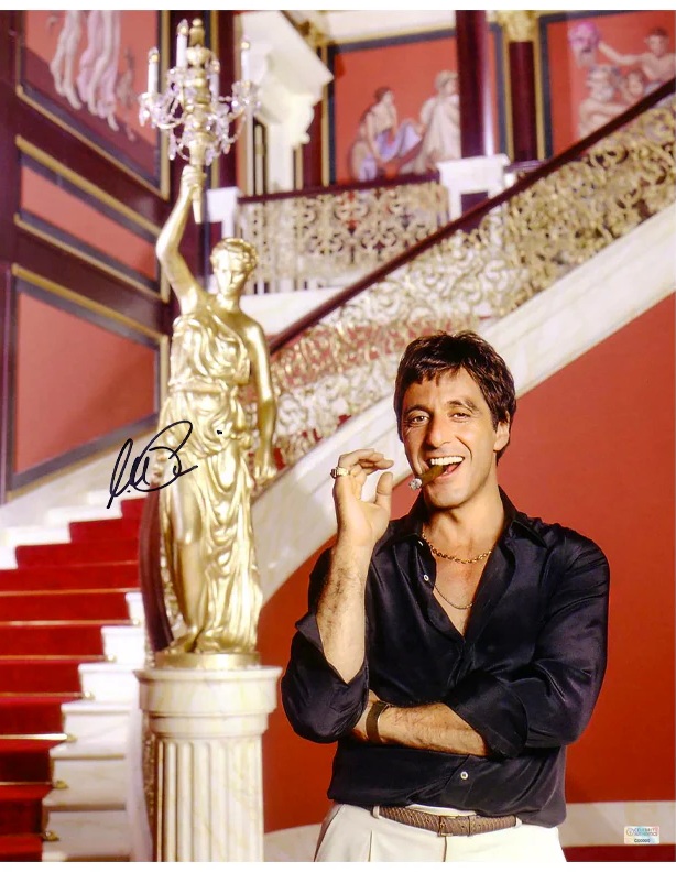 This 16x20 photo of Tony Montana from Scarface has been personally hand-signed by Al Pacino during his signing with Celebrity Authentics. After getting a green card in exchange for assassinating a Cuban government official, Tony Montana (Al Pacino) stakes a claim on the drug trade in Miami. Viciously murdering anyone who stands in his way, Tony eventually becomes the biggest drug lord in the state, controlling nearly all the cocaine that comes through Miami. But increased pressure from the police, wars with Colombian drug cartels and his own drug-fueled paranoia serve to fuel the flames of his eventual downfall. Ships affixed with the Celebrity Authentics serial-numbered and tamper evident Authentication Hologram and includes Celebrity Authentics Certificate of Authenticity featuring a picture of Al signing photo.