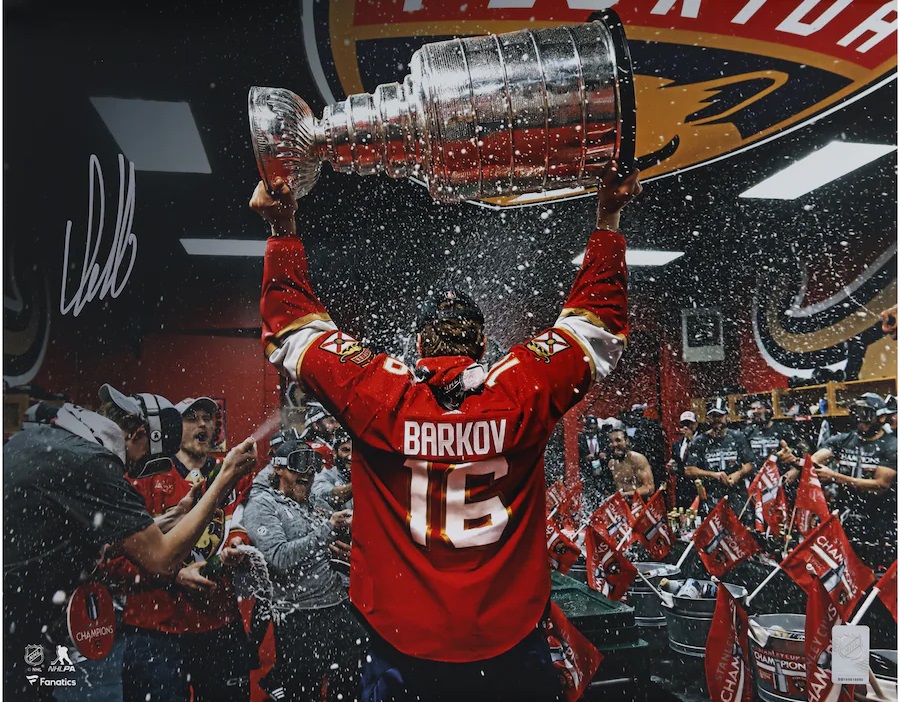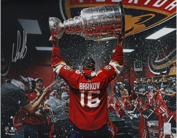 Aleksander Barkov Florida Panthers Autographed 2024 Stanley Cup Champions 16″ x 20″ Locker Room Raising Cup Photograph