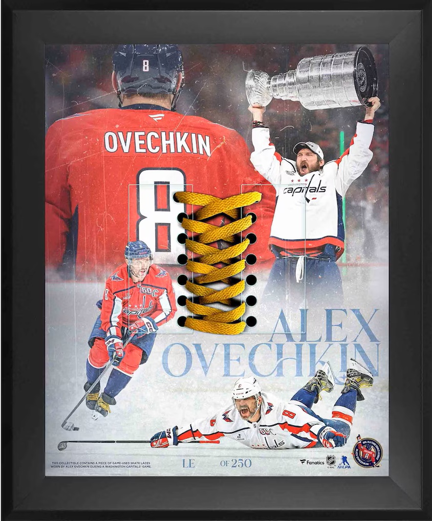 Celebrate the lasting legacy of Alexander Ovechkin as he sets the standard for goal-scoring greatness. "The Great Eight" has captivated fans with his unparalleled skill and determination, leading the Washington Capitals for more than two decades. This framed 16" x 20" collage commemorates his remarkable career, showcasing iconic moments and achievements. Adding a tangible piece of hockey history, it also features game-used laces worn by Ovi during a Capitals game. Limited to only 250 editions, this ready-to-hang piece comes with an individually numbered, tamper-evident hologram to ensure its authenticity for NHL fans.