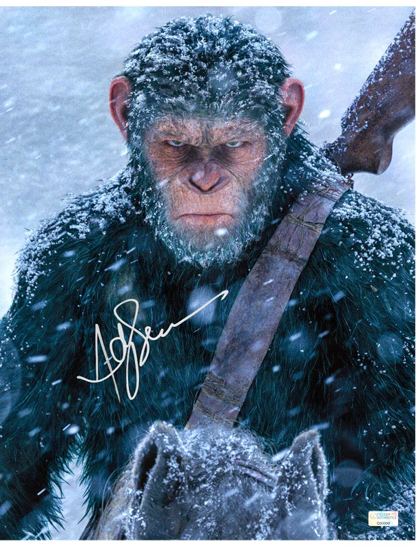 This 11x14 scene shot of Caesar from War for the Planet of the Apes has been personally hand-signed by motion capture icon, Andy Serkis during his signing with Celebrity Authentics. Caesar (Andy Serkis) and his apes are forced into a deadly conflict with an army of humans led by a ruthless colonel (Woody Harrelson). After the apes suffer unimaginable losses, Caesar wrestles with his darker instincts and begins his own mythic quest to avenge his kind. As the journey finally brings them face to face, Caesar and the colonel are pitted against each other in an epic battle that will determine the fate of both of their species and the future of the planet. Fantastic image ships affixed with Celebrity Authentics serial-numbered and tamper evident Authentication Hologram and includes Celebrity Authentics Certificate of Authenticity featuring picture of Andy signing photo.