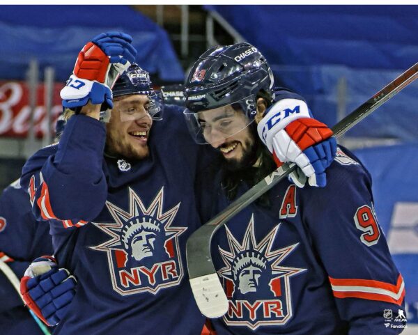 Artemi Panarin & Mika Zibanejad New York Rangers Unsigned Reverse Retro Jersey Win Celebration Photograph