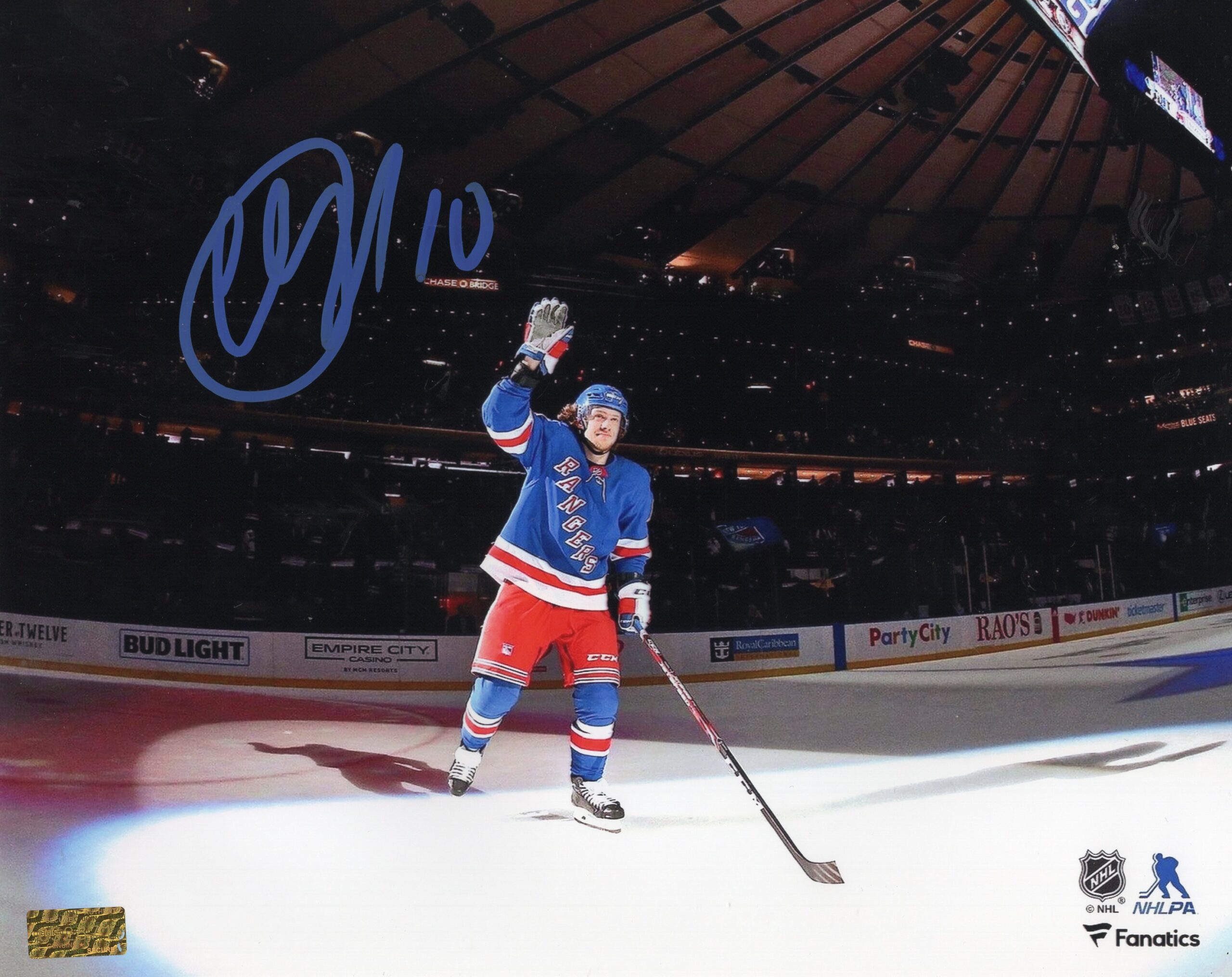 This compelling 8x10 photo features Artemi Panarin proudly acknowledging the fans while wearing his New York Rangers uniform, capturing a genuine moment of connection between star and crowd. With his stick raised and a look of appreciation on his face, Panarin’s leadership, humility, and passion for the game shine through as he salutes the supporters at Madison Square Garden.