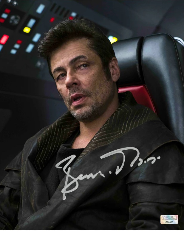 This 2017 Star Wars: The Last Jedi 8x10 Photo of Benicio Del Toro as DJ has been personally autographed by Benicio during his exclusive signing with Celebrity Authentics! The Star Wars saga continues as new heroes and galactic legends go on an epic adventure, unlocking mysteries of the Force and shocking revelations of the past. Ships affixed with Celebrity Authentics serial-numbered Authentication hologram and includes Celebrity Authentics Certificate of Authenticity featuring picture of Benicio signing photo.