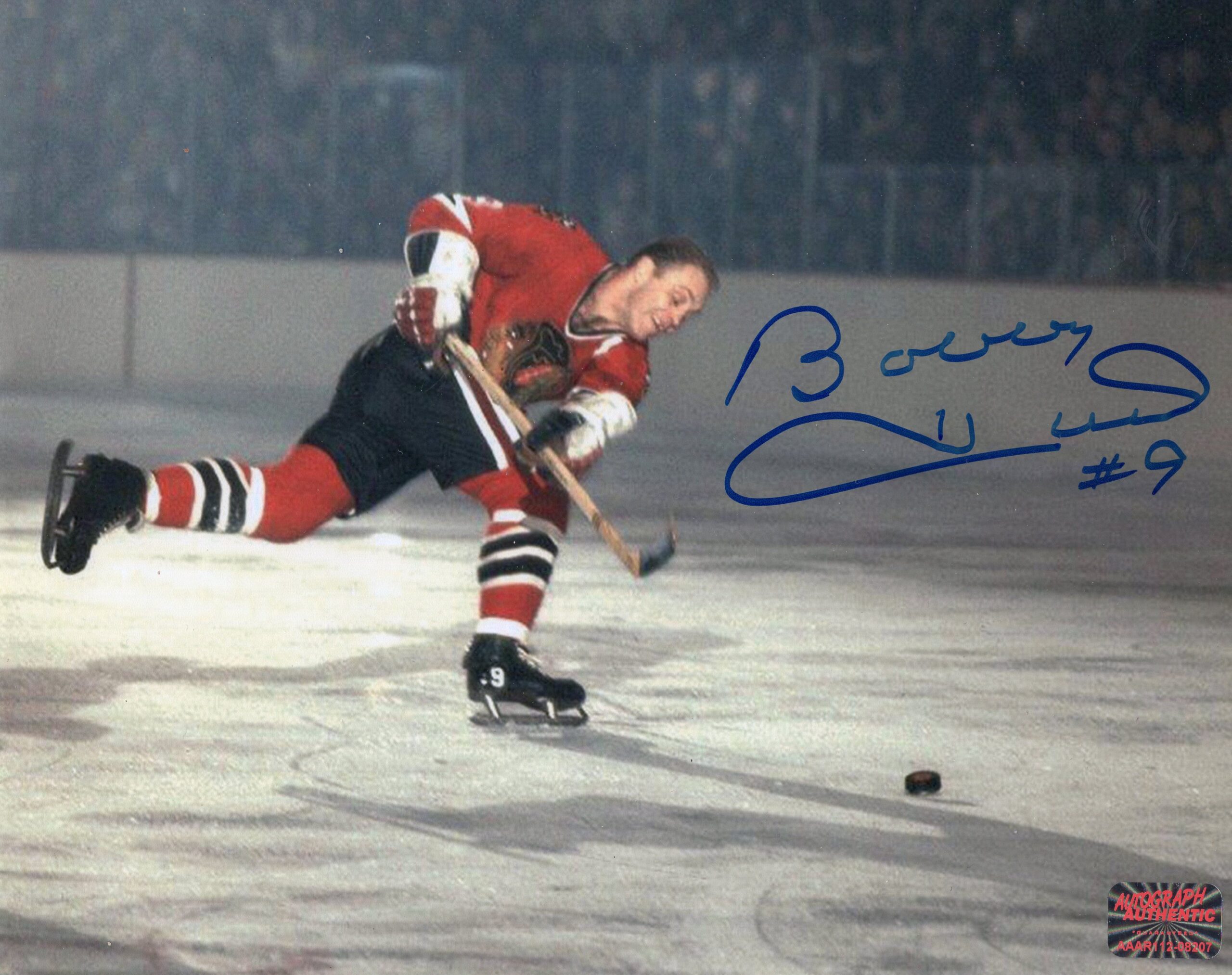 This autographed 8x10 photo captures Bobby Hull, the legendary “Golden Jet,” in a classic action moment as he winds up for a powerful slap shot. Wearing his iconic Chicago Blackhawks uniform, Hull’s explosive skating stride and unmistakable shooting form are on full display, showcasing the blistering shot that made him one of the most feared scorers in hockey history. The vintage on-ice setting adds to the timeless feel of the image, transporting fans back to the golden era of the NHL. His bold autograph is cleanly signed on the photo, making this a premium collectible that celebrates Hull’s Hall of Fame career and legendary shooting ability.