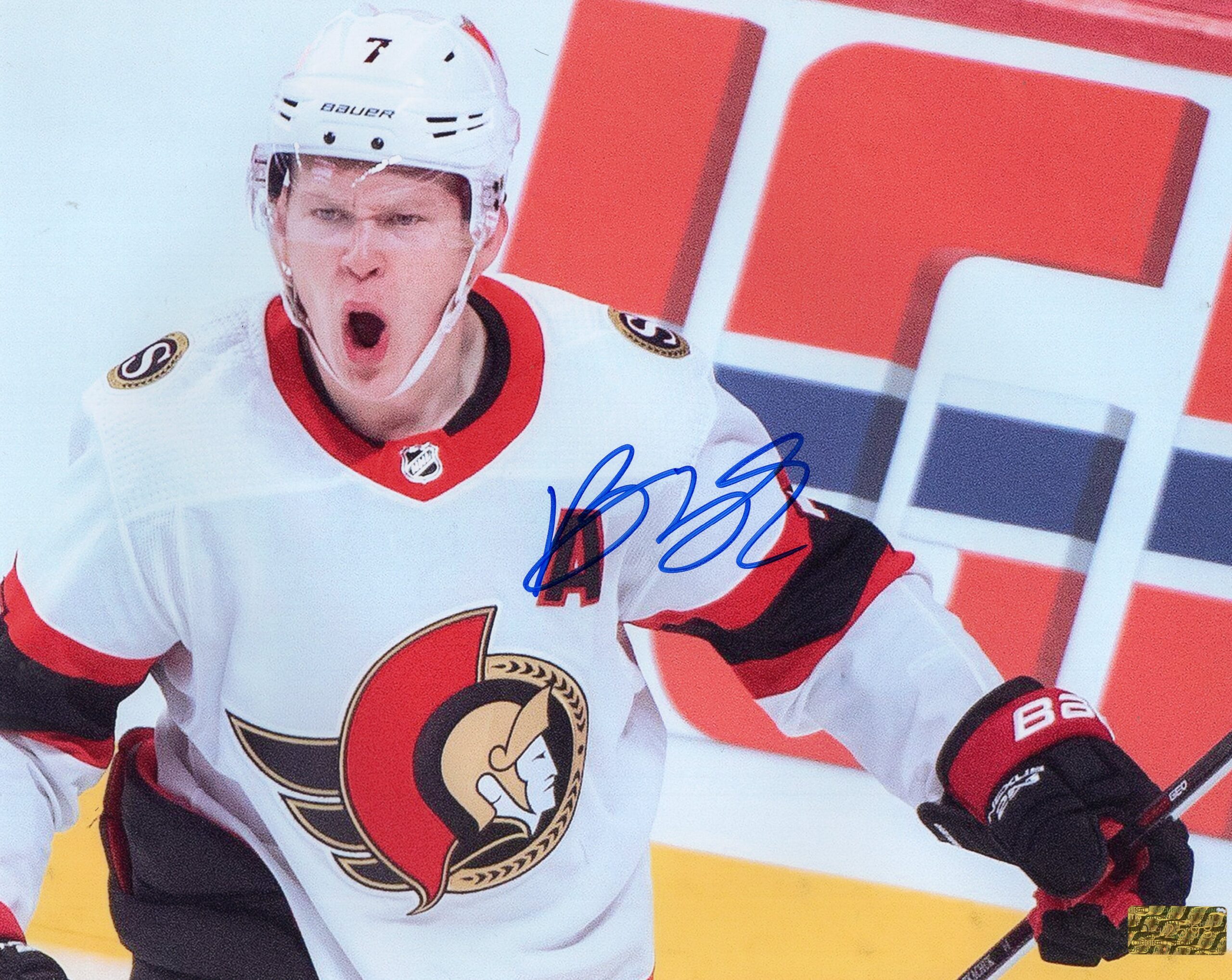 This striking 8x10 photograph captures Ottawa Senators captain Brady Tkachuk in the heat of action, showcasing the relentless intensity and leadership that define his game. Tkachuk is pictured driving hard toward the net, his trademark physical presence on full display as he battles through defenders with determination in his eyes. The image highlights his bold red Senators jersey, with crisp detail that brings every stitch, skate mark, and moment of motion to life.