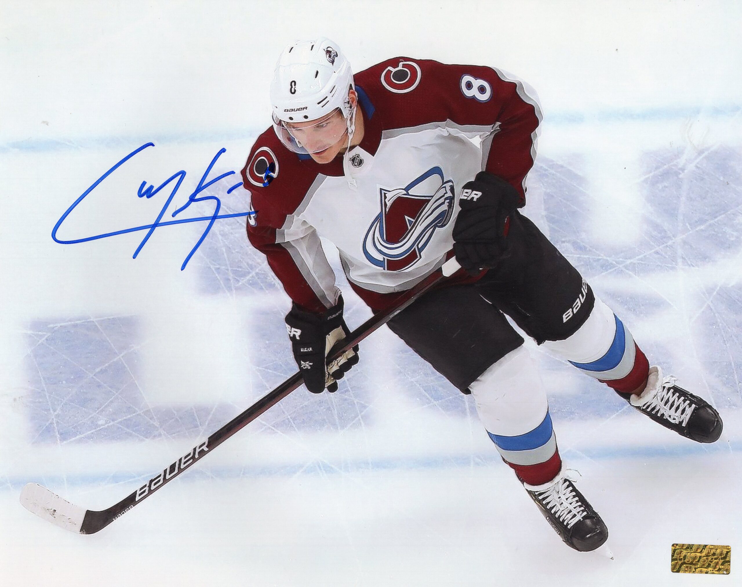 This autographed 8x10 photo features Colorado Avalanche superstar defenseman Cale Makar surveying the ice as he looks to make a pass, showcasing his elite hockey IQ and smooth skating ability. Captured in crisp game action, Makar is shown poised with the puck on his stick, reading the play with the calm confidence that defines his game. Dressed in his Avalanche uniform, the image highlights the vision and precision that make him one of the NHL’s premier defensemen. Hand-signed by Makar, this photo is a must-have collectible for Avalanche fans and hockey memorabilia collectors alike.