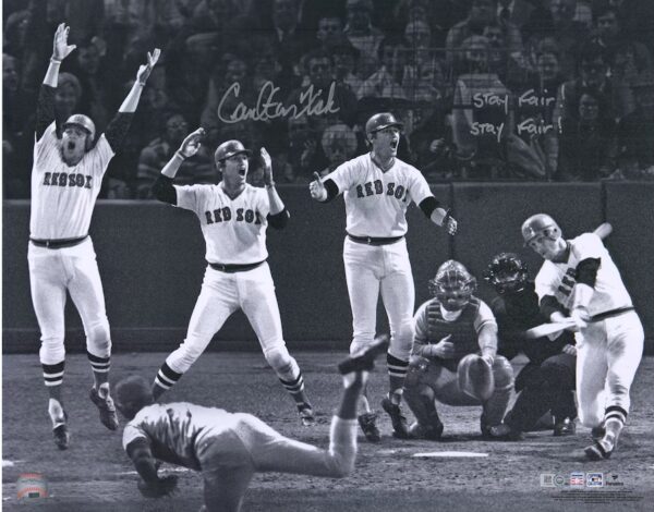 Carlton Fisk Boston Red Sox Autographed 16″ x 20″ 1975 World Series Home Run Black & White Photograph with “Stay Fair! Stay Fair!” Inscription
