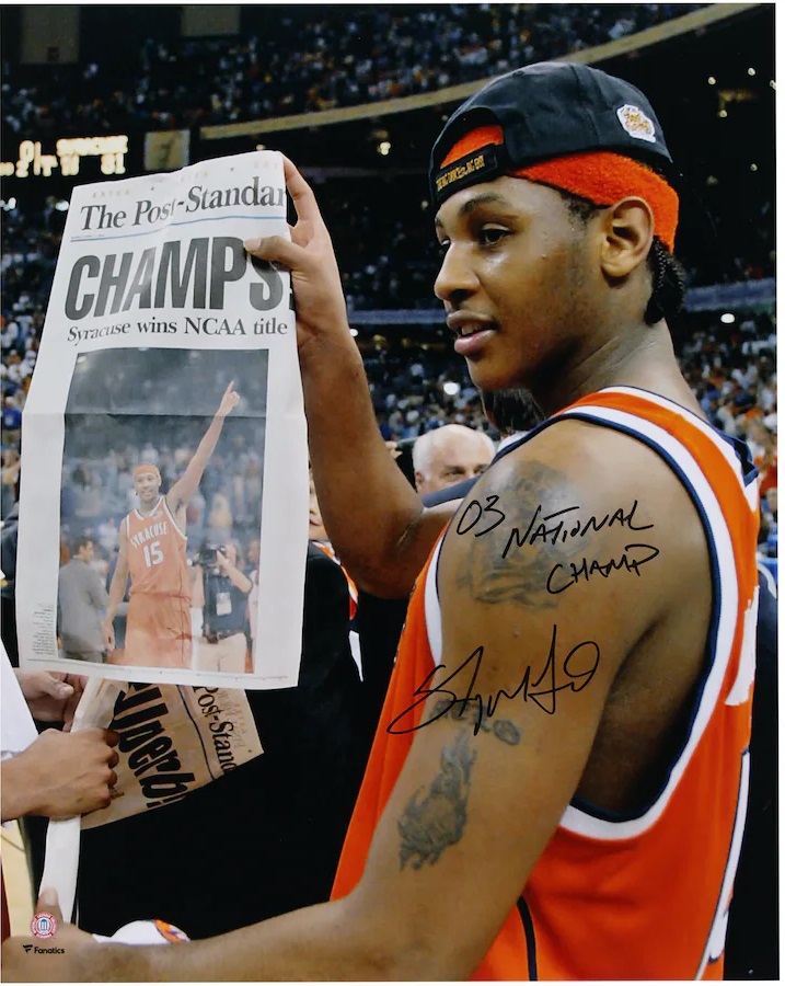 Relive a special moment in basketball history with this signed photo of Carmelo Anthony celebrating the Syracuse Orange's 2003 National Championship victory. This photo shows a young Melo holding a copy of Syracuse newspaper The Post-Standard, which features a picture of Anthony under the headline "CHAMPS! Syracuse wins NCAA title." Included with the star forward's signature is the inscription "03 NATIONAL CHAMP" to commemorate the historic Orange win.