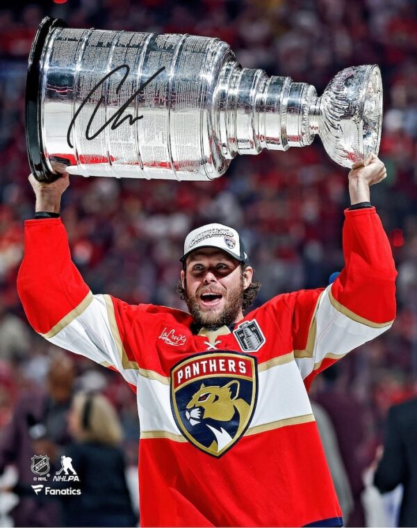 Carter Verhaeghe Florida Panthers Autographed 2025 Stanley Cup Champions 8″ x 10″ Raising Cup Photograph