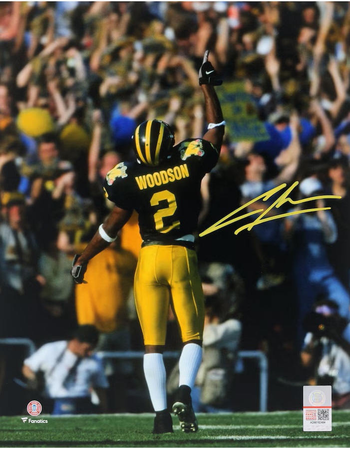 Charles Woodson Michigan Wolverines Autographed 8″ x 10″ Pointing Up Photograph – Signed in Yellow Ink