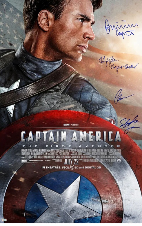 This Captain America: The First Avenger Original 27x40 Double-Sided Movie Poster has been personally hand-signed by Chris Evans (Captain America) and Dominic Cooper (Howard Stark) during their signings with Celebrity Authentics. It is 1941 and the world is in the throes of war. Steve Rogers (Chris Evans) wants to do his part and join America's armed forces, but the military rejects him because of his small stature. Finally, Steve gets his chance when he is accepted into an experimental program that turns him into a supersoldier called Captain America. Joining forces with Bucky Barnes (Sebastian Stan) and Peggy Carter (Hayley Atwell), Captain America leads the fight against the Nazi-backed HYDRA organization. Ships affixed with the Celebrity Authentics serial-numbered and tamper evident Authentication Hologram and includes Celebrity Authentics Certificates of Authenticity featuring a picture of each actor signing poster.