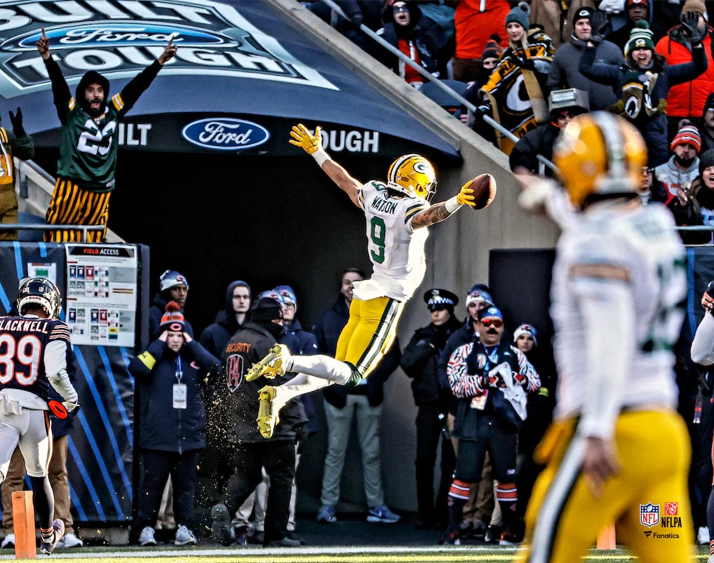 Christian Watson Green Bay Packers Unsigned Leaping for a Touchdown Photograph