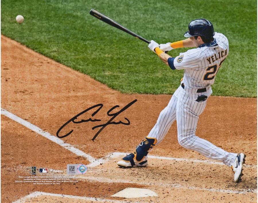 This 16" x 20" photograph has been personally hand-signed by Christian Yelich. It has been obtained under the auspices of the Major League Baseball Authentication Program and can be verified by its numbered hologram at MLB.com. It also comes with an individual numbered, tamper-evident hologram from Fanatics Authentic. This process helps to ensure that the product purchased is authentic and eliminates any possibility of duplication or fraud.