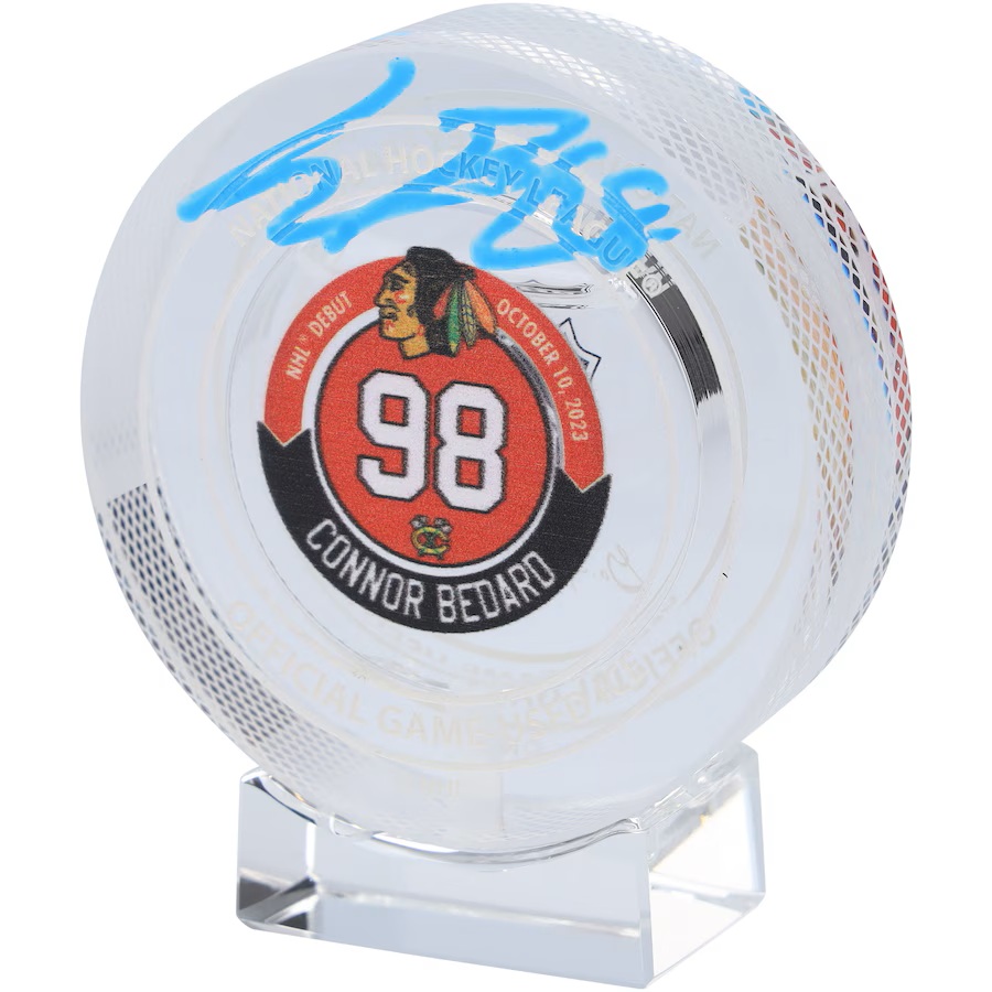 Connor Bedard Chicago Blackhawks Autographed NHL Debut Crystal Puck – Filled with Ice from NHL Debut Game