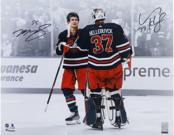 Connor Hellebuyck & Mark Scheifele Winnipeg Jets Autographed 16″ x 20″ Navy Alternate Jersey Celebration Spotlight Photograph