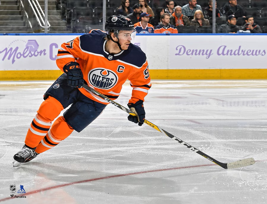 / Connor McDavid Edmonton Oilers Unsigned Orange Jersey Skating Photograph