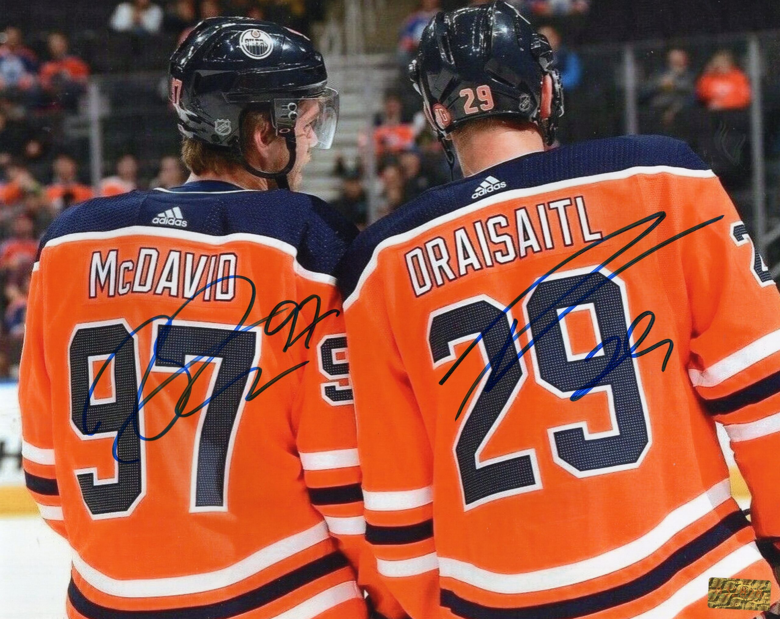 Connor McDavid & Leon Draisaitl Edmonton Oilers Orange Jersey Autographed 8×10 Photo