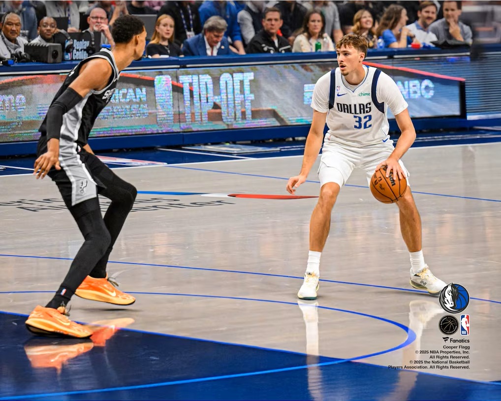 Boost your NBA collection with this Cooper Flagg photograph. It showcases Flagg during his highly anticipated NBA debut with the Dallas Mavericks where he dropped a double-double against the San Antonio Spurs. With a striking image of the star forward facing off against Victor Wembanyama, this photo is a must-have for any Mavericks supporter or collector eager to celebrate the beginning of Flagg's promising career.