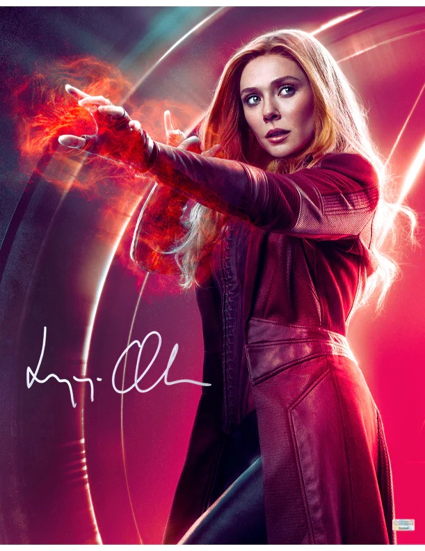 This 16x20 photo of Marvel's Scarlet Witch has been personally hand-signed by Elizabeth Olsen during her signing with Celebrity Authentics. Photo ships affixed with Celebrity Authentics serial-numbered and tamper evident Authentication Hologram and includes Celebrity Authentics Certificate of Authenticity featuring picture of Elizabeth signing photo.