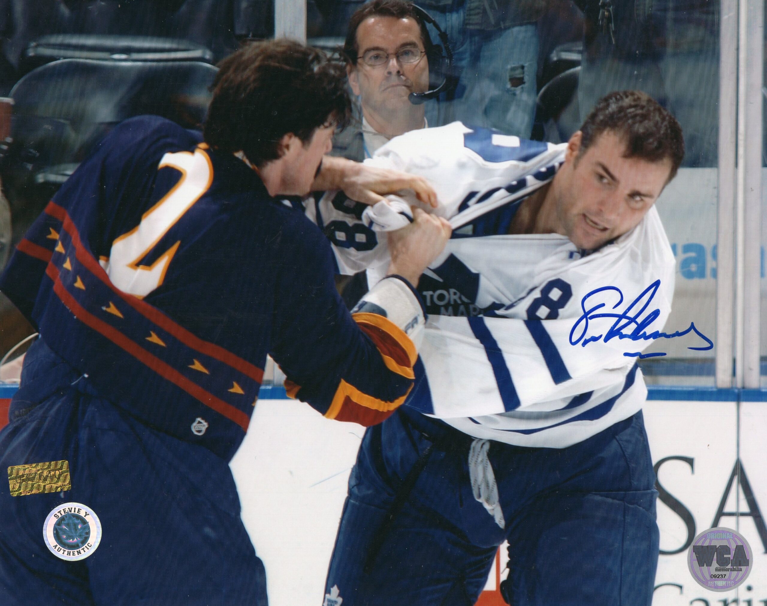 An 8x10 action photo of Eric Lindros during his time with the Toronto Maple Leafs, capturing him dropping the gloves in the classic blue-and-white uniform. The image highlights his trademark strength and intensity, making it a standout piece for any Leafs or Lindros fan.