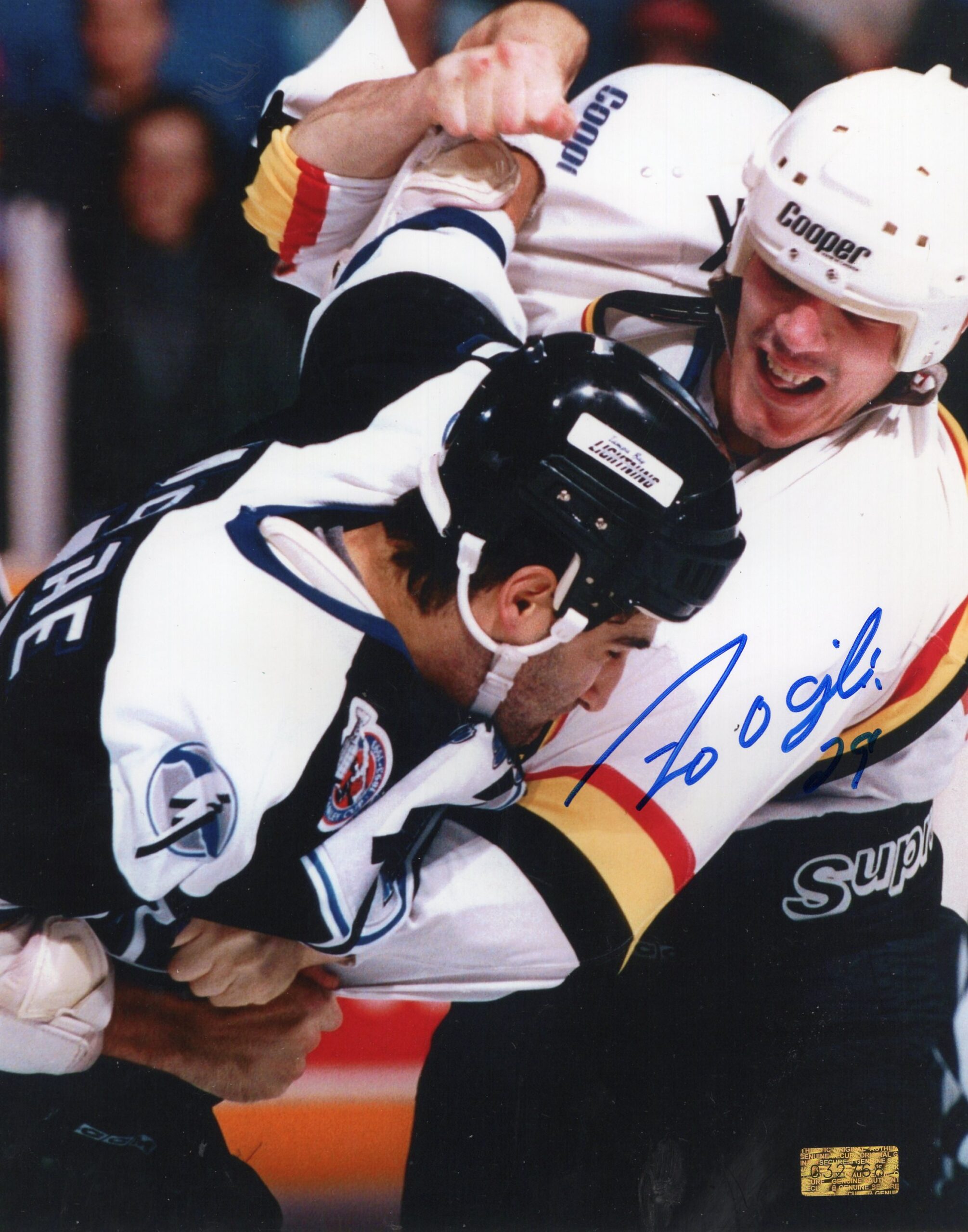 This autographed 8x10 photo features Gino Odjick in his prime with the Vancouver Canucks, captured in a classic fighting stance that made him one of the most feared and beloved enforcers of his era. Wearing the iconic Canucks uniform, Odjick is locked in a heated moment, gloves off and intensity etched across his face, perfectly showcasing his toughness, courage, and willingness to stand up for his teammates. The raw energy of the confrontation is unmistakable, bringing the emotion and grit of 1990s Canucks hockey to life. His authentic autograph is boldly signed on the photo, making this a powerful collectible that pays tribute to Odjick’s heart, loyalty, and legendary role in Vancouver hockey history.