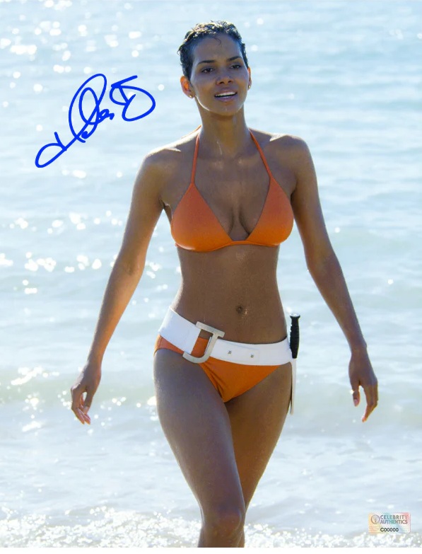This 2002 Die Another Day 11x14 Beach Photo has been personally autographed by award winning film star, Halle Berry during her exclusive signing with Celebrity Authentics. James Bond (Pierce Brosnan) is captured by North Korean agents and must serve a grueling prison sentence. He's finally released, and is convinced that someone in his own agency betrayed him. He escapes from custody and travels to Cuba, hot on the heels of Zao (Rick Yune), the agent who put Bond behind bars. Meanwhile, Bond begins romancing NSA agent Jinx (Halle Berry) as he uncovers a scheme concocted by Zao and British millionaire Graves (Toby Stephens), involving a highly destructive laser. Ships affixed with Celebrity Authentics serial-numbered Authentication hologram and includes Celebrity Authentics Certificate of Authenticity featuring picture of Halle signing photo.