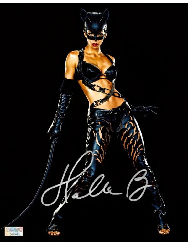 This 2004 Catwoman Studio 8x10 Photo has been personally autographed by award winning film star, Halle Berry during her exclusive signing with Celebrity Authentics. "Catwoman" is the story of shy, sensitive artist Patience Philips (Halle Berry), a woman who can't seem to stop apologizing for her own existence. She works as a graphic designer for Hedare Beauty, a mammoth cosmetics company on the verge of releasing a revolutionary anti-aging product. When Patience inadvertently happens upon a dark secret her employer is hiding, she finds herself in the middle of a corporate conspiracy. What happens next changes Patience forever. Ships affixed with Celebrity Authentics serial-numbered Authentication hologram and includes Celebrity Authentics Certificate of Authenticity featuring picture of Halle signing photo.