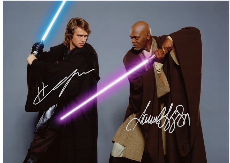 This Star Wars 11x14 photo of Mace Windu and Anakin Skywalker has been personally hand-signed by Hayden Christensen (Anakin Skywalker/Darth Vader) and Samuel L. Jackson (Mace Windu) during their signings with Celebrity Authentics. This rare dual-signed photo ships affixed with the Celebrity Authentics serial-numbered and tamper evident Authentication Hologram and includes Celebrity Authentics Certificates of Authenticity featuring picture of Hayden and Samuel signing photo.