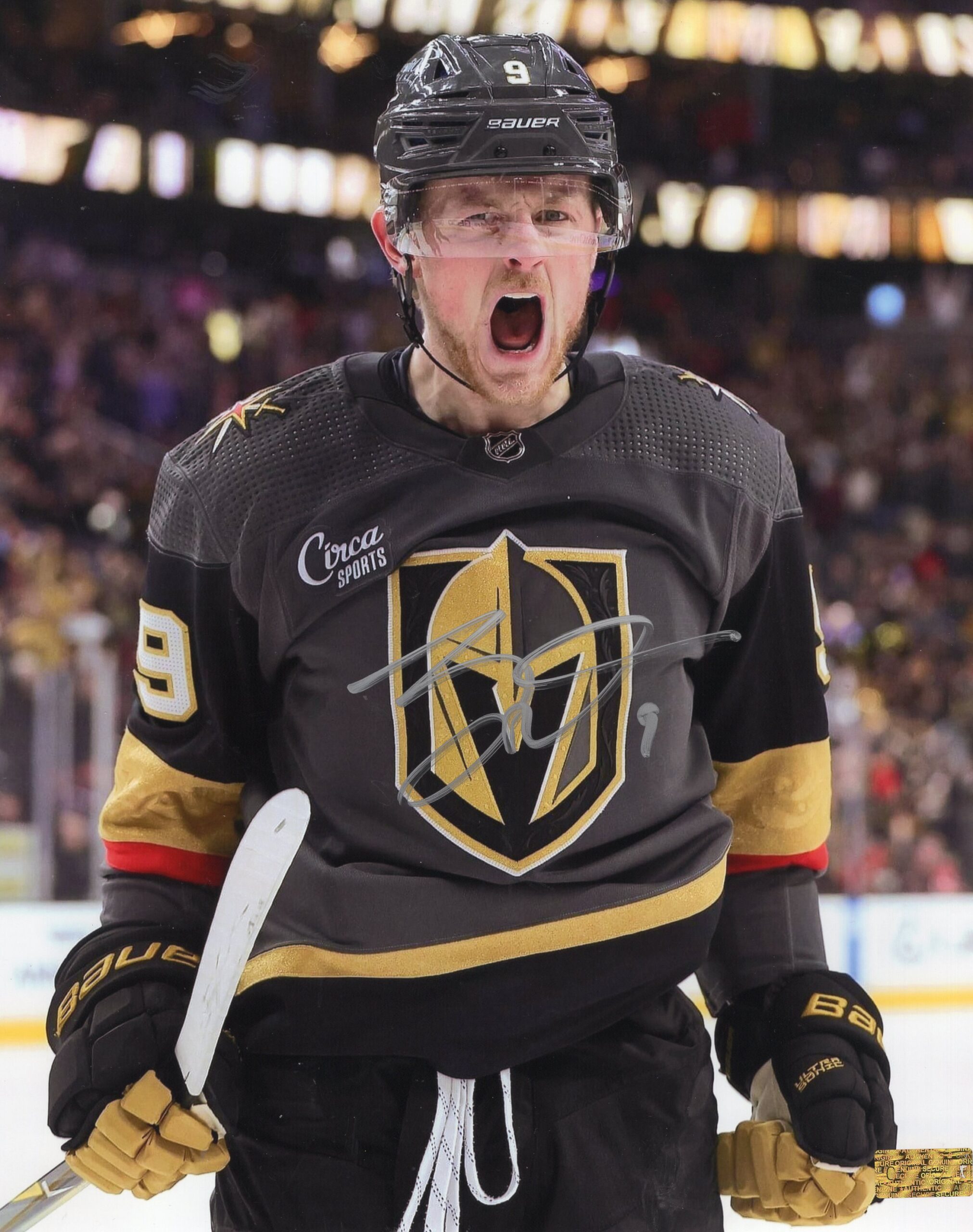 This autographed 8x10 photo captures Jack Eichel in a raw, emotional moment as he yells “VEGAS!” in celebration, perfectly embodying the passion and swagger of the Vegas Golden Knights. Wearing his Golden Knights uniform, Eichel’s intensity is on full display—mouth open in a triumphant roar, eyes blazing with adrenaline after a big play or victory moment. The background features the bright lights and energy of the rink, adding to the electrifying atmosphere. His bold autograph, cleanly signed on the image, stands out beautifully, making this a striking collectible that celebrates Eichel’s leadership, championship mindset, and unforgettable presence in Vegas.