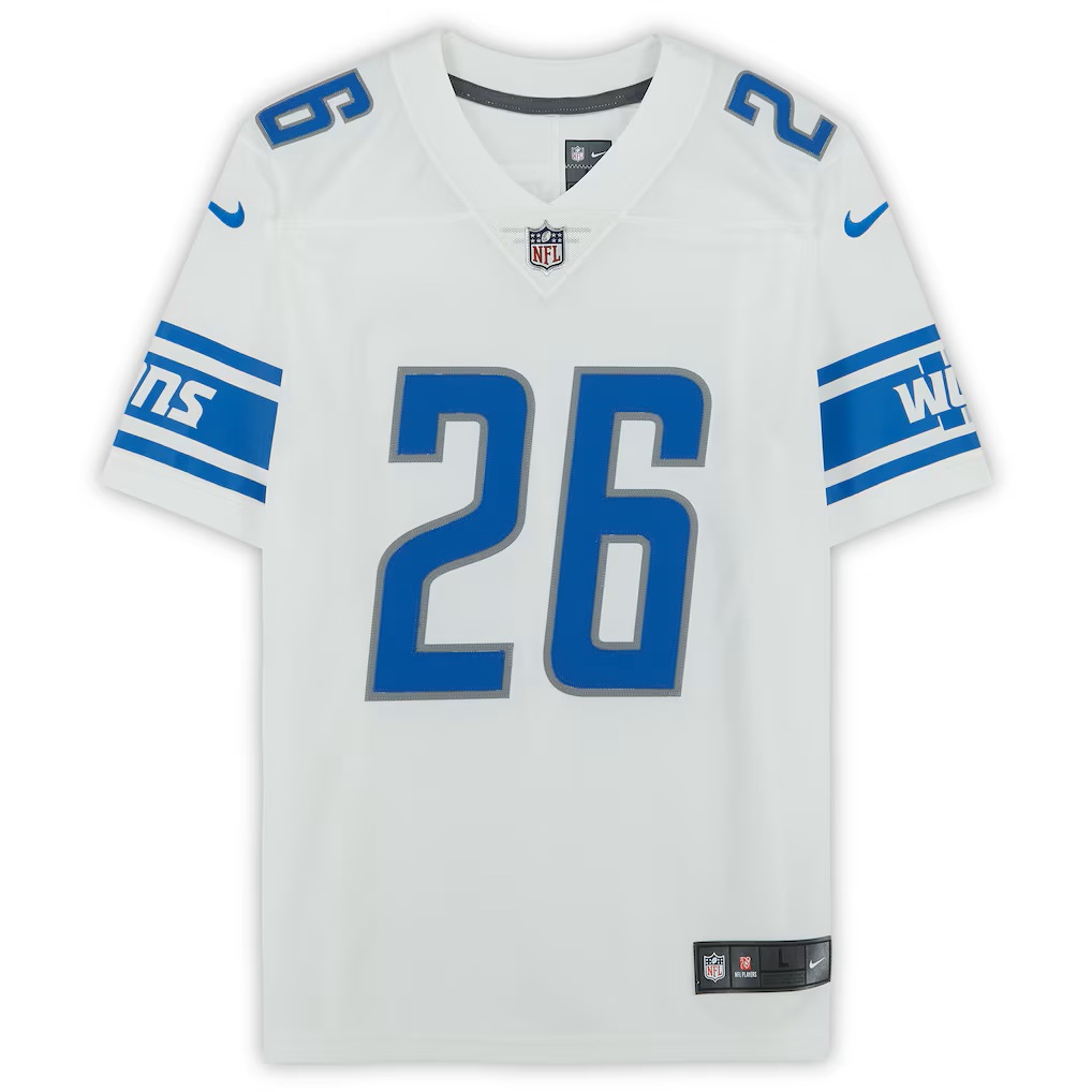 Elevate your collection of Detroit Lions memorabilia with this Jahmyr Gibbs autographed White Nike Vapor F.U.S.E Jersey. It features eye-catching team details and a distinct signature from the superstar running back. Additionally, this collectible includes an individually numbered, tamper-evident hologram that can be verified online to certify authenticity.