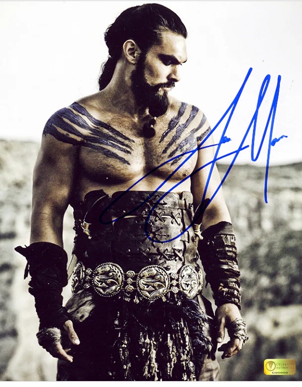 This 8x10 photo of Khal Drogo, Dothraki warrior from Game of Thrones has been personally hand-signed by Jason Momoa during his autograph signing with Celebrity Authentics.George R.R. Martin's best-selling book series "A Song of Ice and Fire" is brought to the screen as HBO sinks its considerable storytelling teeth into the medieval fantasy epic. It's the depiction of two powerful families -- kings and queens, knights and renegades, liars and honest men -- playing a deadly game for control of the Seven Kingdoms of Westeros, and to sit atop the Iron Throne. Martin is credited as a co-executive producer and one of the writers for the series, whose shooting locations include Northern Ireland, Malta, Croatia and Spain. Ships affixed with the Celebrity Authentics serial-numbered and tamper evident Authentication Hologram and includes Celebrity Authentics Certificate of Authenticity featuring a picture of Jason signing photo.