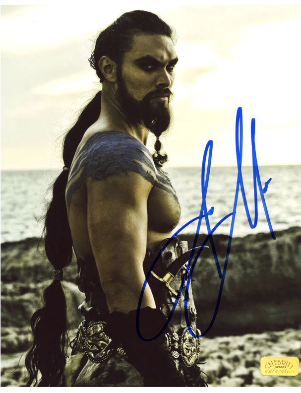 This 8x10 photo of Khal Drogo, Dothraki warrior from Game of Thrones has been personally hand-signed by Jason Momoa during his autograph signing with Celebrity Authentics. Item ships affixed with the Celebrity Authentics serial-numbered and tamper evident Authentication Hologram and includes Celebrity Authentics Certificate of Authenticity featuring a picture of Jason signing photo.