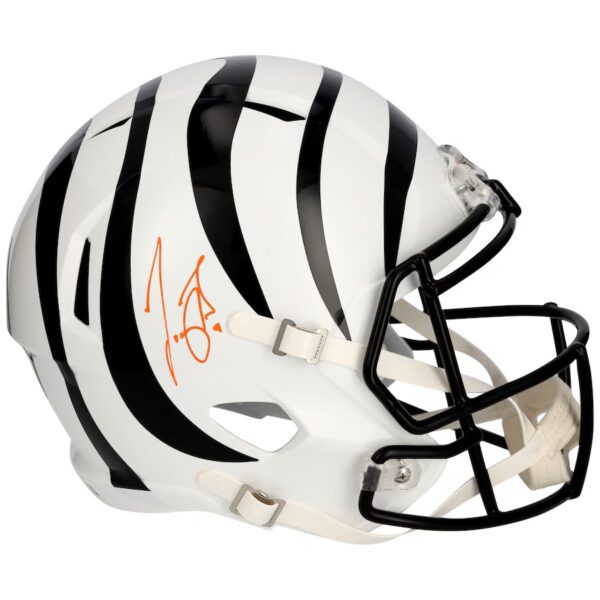 Add one of the NFL's best quarterbacks to your Cincinnati Bengals' memorabilia collection by picking up this Joe Burrow autographed 2022 Alternate Riddell Speed Replica Helmet. Following a legendary 2019 season at LSU, the Bengals would draft Burrow number one overall in the 2020 NFL Draft. After an injury-shortened rookie season, he would come back in 2021 and lead the Bengals to their first postseason win and Super Bowl appearance in more than 30 years. In 2022, he earned his first Pro Bowl selection after tossing for 4,475 yards and 35 touchdowns, while he also helped lift the team to a second-straight appearance in the AFC Championship. Leave no doubt that you are the number one supporter of Burrow and the Bengals by making this hand-signed helmet part of your collection.
