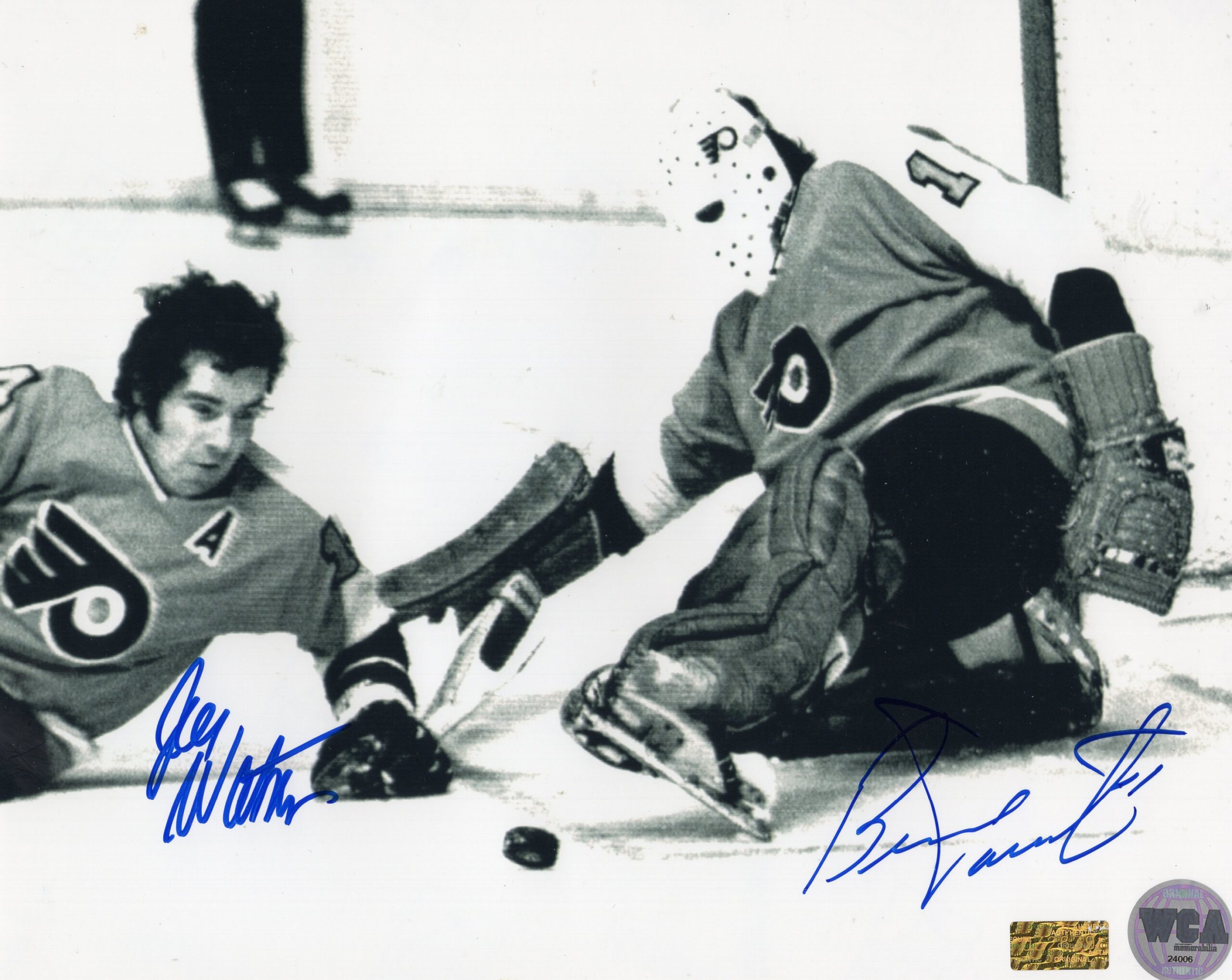 Joe Watson & Bernie Parent Philadelphia Flyers Making A Save Autographed 8×10 Photo