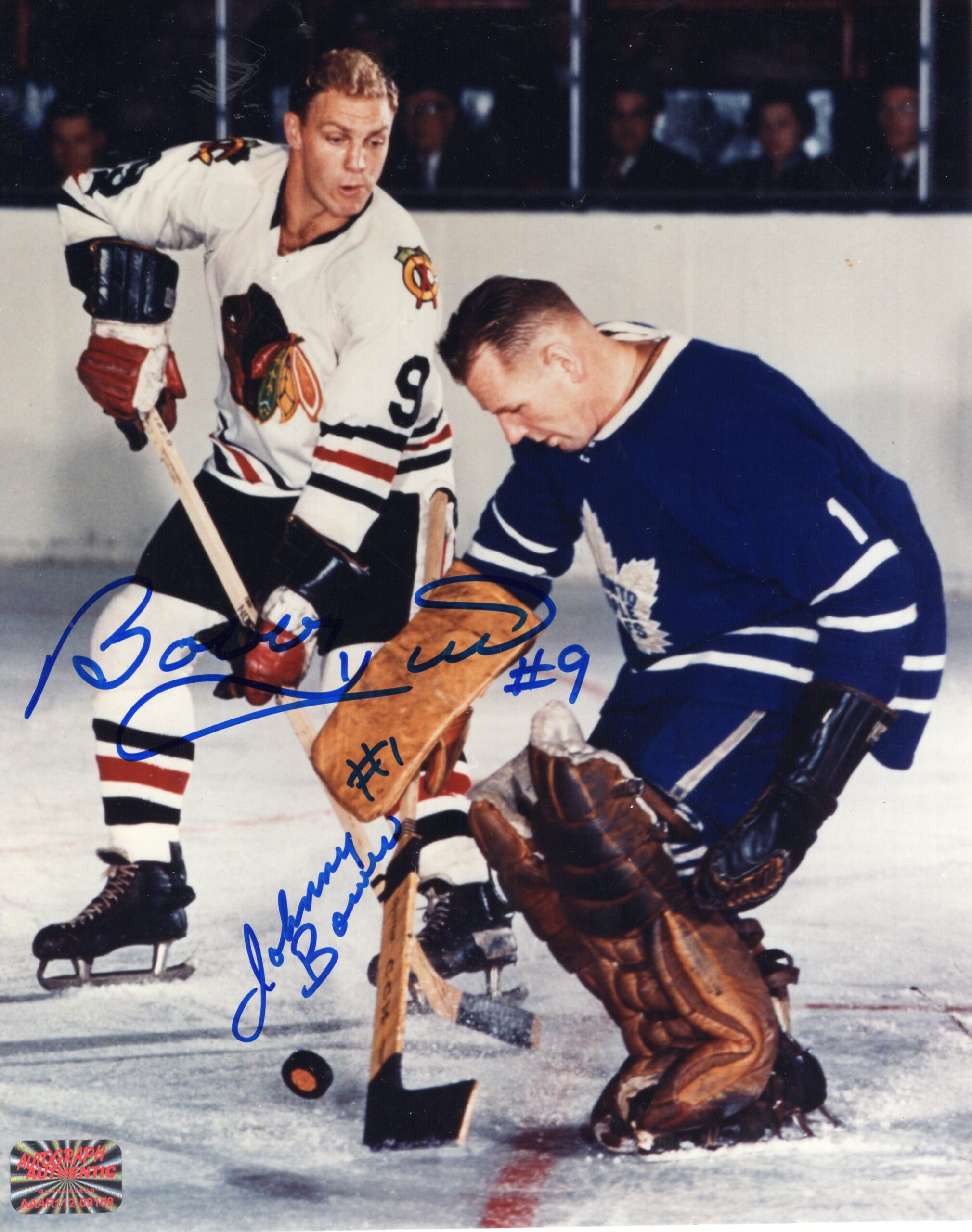 This autographed 8x10 photo features two Chicago Blackhawks legends, goaltender Johnny Bower and superstar forward Bobby Hull, together in a timeless hockey image. Representing an iconic era in NHL history, the photo highlights Bower’s legendary presence in goal alongside Hull’s unmistakable offensive brilliance. Dressed in classic Blackhawks uniforms, this image captures the heritage and tradition of one of the league’s Original Six franchises. Hand-signed by both Bower and Hull, this duo-autographed photo is a prized collectible for Blackhawks fans and hockey memorabilia collectors, celebrating two Hall of Fame greats.
