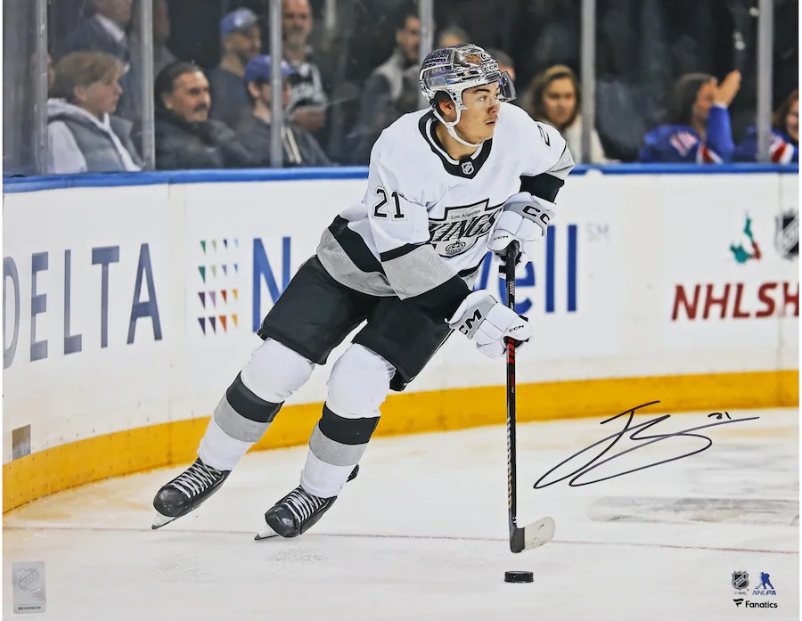 Jordan Spence Los Angeles Kings Autographed 8″ x 10″ White Jersey with Puck Photograph