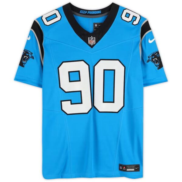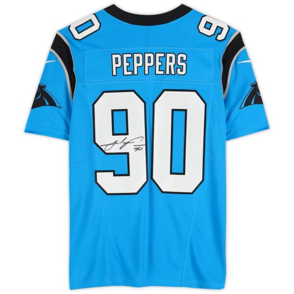 Elevate your Carolina Panthers collection with a Nike Limited Blue Alternate Authentic Jersey signed by Julius Peppers. This officially licensed NFL jersey features Peppers' distinct autograph on the outside and the Panthers' "Keep Pounding" mantra stitched inside the neck, making it a must-have for Carolina football fans. To ensure its authenticity, this officially licensed collectible includes a numbered hologram that can be verified online.