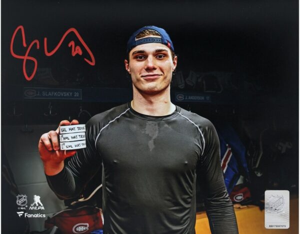 Elevate your collection of Montreal Canadiens memorabilia by picking up this Juraj Slafkovsky autographed 16" x 20" First NHL Hat Trick Photograph. Featuring a striking signature from the Montreal Canadiens star, it's a must-have addition for any die-hard fan or serious collector. This collectible also includes an individually numbered, tamper-evident hologram that can be verified online to certify its authenticity.