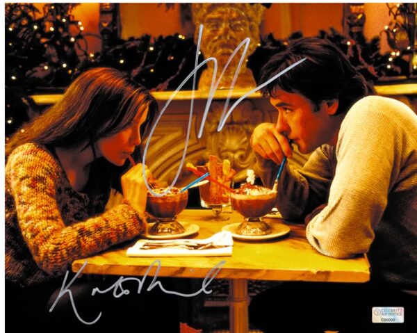 This 8x10 photo from the hit movie Serendipity has been personally hand-signed by Kate Beckinsale and John Cusack during their signings with Celebrity Authentics. In this classic romance film, Sara (Kate Beckinsale) asks Jonathan (John Cusack) to write his name and phone number on a $5 bill, while she writes her name and number on the inside cover of a copy of Love in the Time of Cholera. If they are meant to be together, he will find the book and she will find the $5 bill, and they will find their way back to each other. Ships affixed with Celebrity Authentics serial-numbered and tamper evident Authentication Hologram and Celebrity Authentics Certificates of Authenticity featuring pictures of Kate and John signing photo.