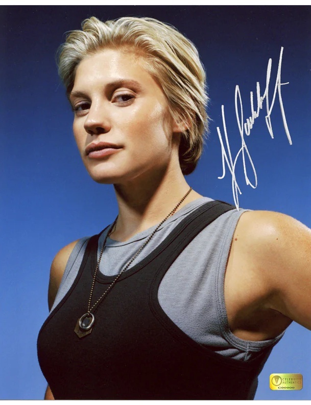 This 8×10 photo of Katee Sackhoff as Starbuck has been personally hand-signed by Katee during her signing with Celebrity Authentics. This update of the late-1970s program takes a decidedly darker tone as what's left of humankind struggles for survival against the robot Cylons, who have killed millions. The Galactica, led by William Adama, protects a patched-together fleet of civilians - led by de facto president Laura Roslin - in search of a mythical planet called Earth. Ships affixed with Celebrity Authentics serial-numbered and tamper evident Authentication Hologram and includes Celebrity Authentics Certificate of Authenticity featuring picture of Katee signing photo.