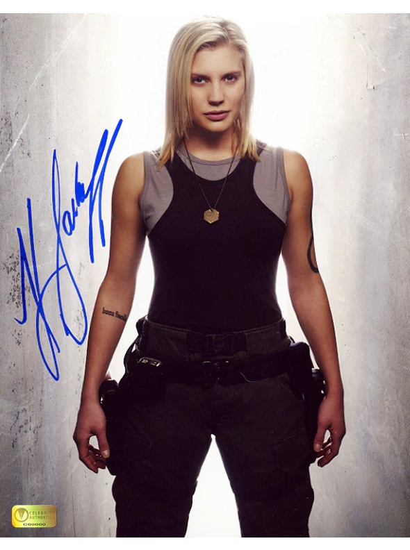 This 8×10 photo of Katee Sackhoff as Starbuck has been personally hand-signed by Katee during her signing with Celebrity Authentics. Item ships affixed with Celebrity Authentics serial-numbered and tamper evident Authentication Hologram and includes Celebrity Authentics Certificate of Authenticity featuring picture of Katee signing photo.