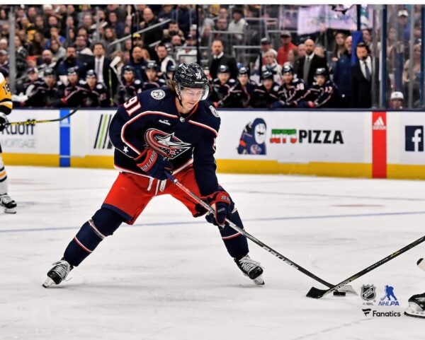/ Kent Johnson Columbus Blue Jackets Unsigned Maneuvers the Puck Photograph