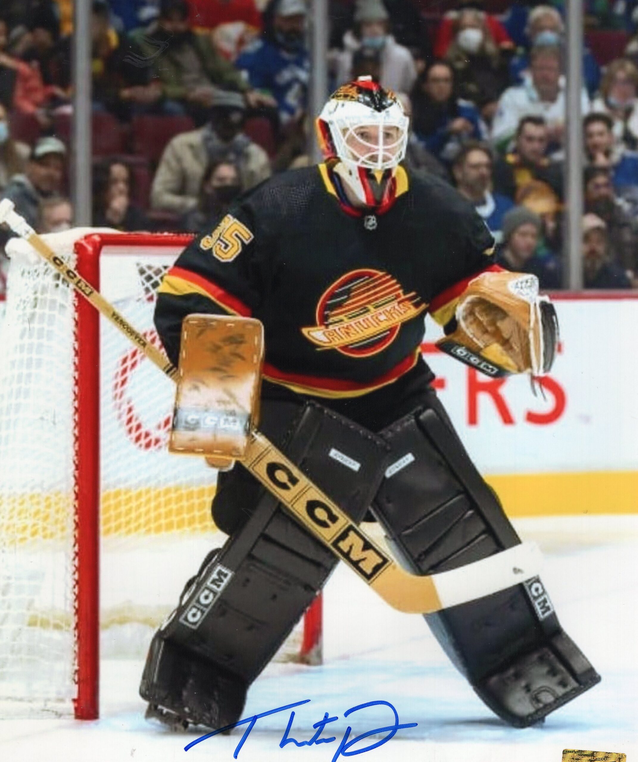 This Kirk McLean autographed 8x10 photo features the Vancouver Canucks legend wearing a crisp black jersey, highlighting his calm, composed presence in the crease. Captured in a classic in-game pose, McLean’s focused expression reflects the reliability and leadership that made him a cornerstone of the Canucks during his standout NHL career. Hand-signed by Kirk McLean, this photo is a timeless collectible for Vancouver fans and hockey memorabilia collectors, celebrating one of the franchise’s most iconic goaltenders.