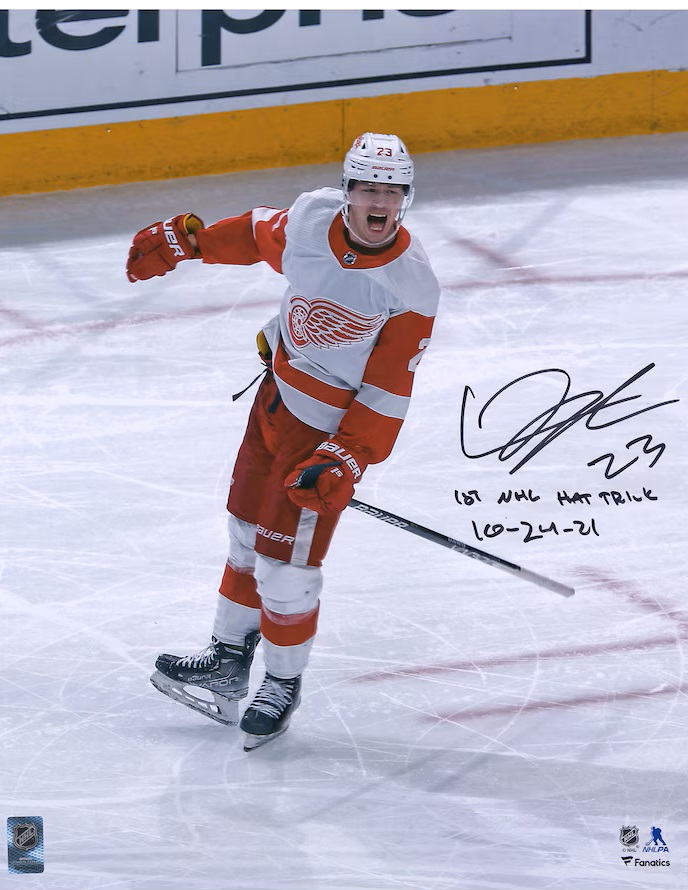 Lucas Raymond Detroit Red Wings Autographed 16″ x 20″ 1st Hat Trick Celebration Photograph with “1st NHL Hat Trick 10-24-21” Inscription