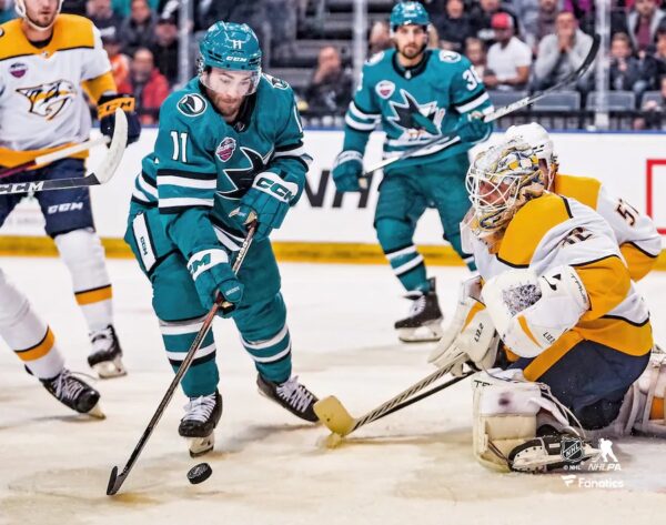 Luke Kunin San Jose Sharks Unsigned Shoots Puck into Goal During 2022 NHL Global Series Challenge Photograph