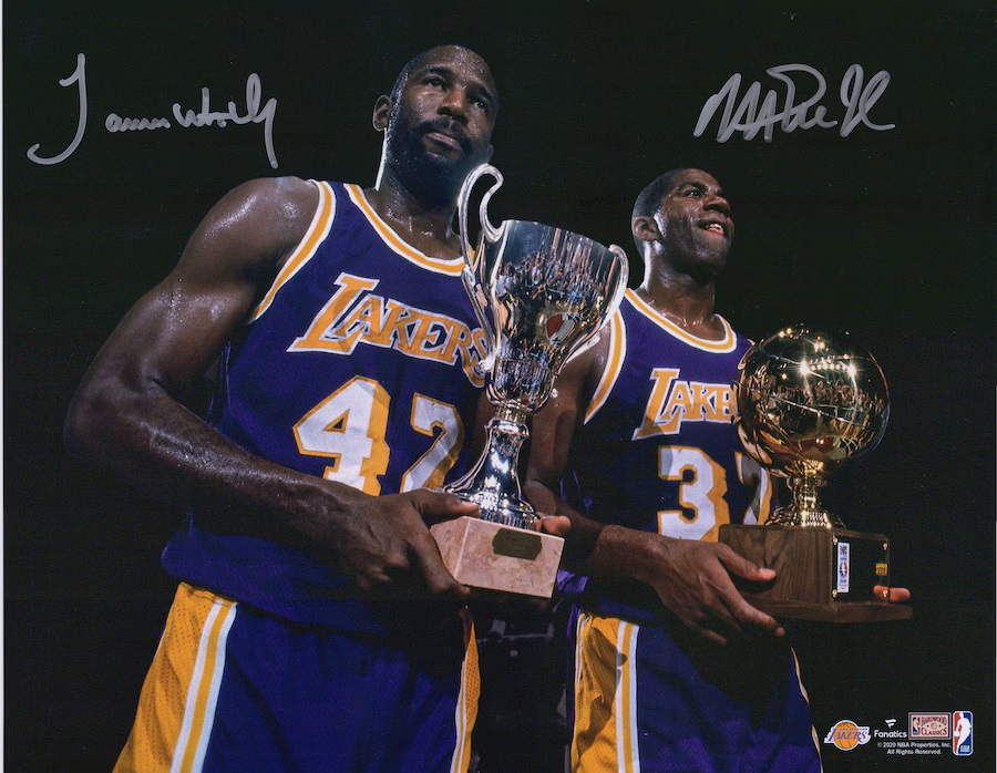 Magic Johnson & James Worthy Los Angeles Lakers Autographed 11″ x 14″ Holding Trophies Photograph