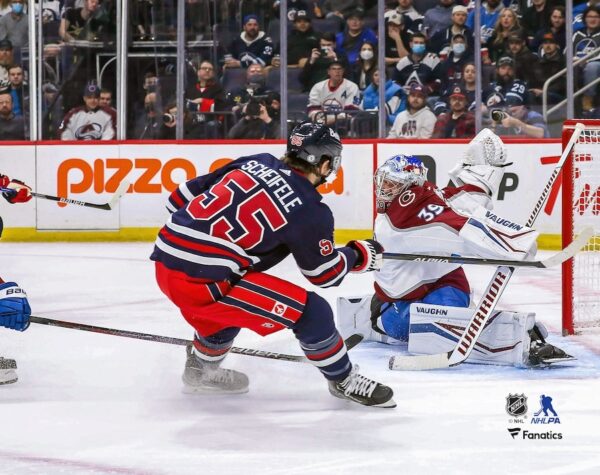 Mark Scheifele Winnipeg Jets Unsigned Shoots Puck Past Goaltender Pavel Francouz Photograph