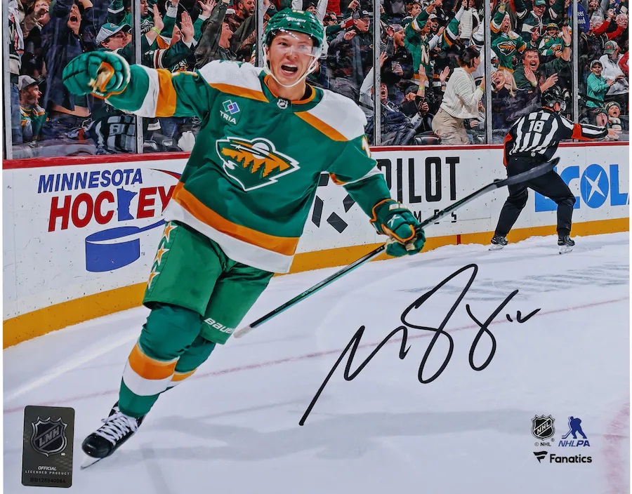 If Matthew Boldy is one of your favorite players on the Minnesota Wild, then be sure to pick up this autographed 8" x 10" Green Alternate Jersey Celebration Photograph. Featuring a hand-signed signature from the star forward, this photo is the perfect option for any die-hard Minnesota Wild fan or serious NHL collector to display in their home or office. This item includes an individually numbered, tamper-evident hologram that can be verified online to certify authenticity.