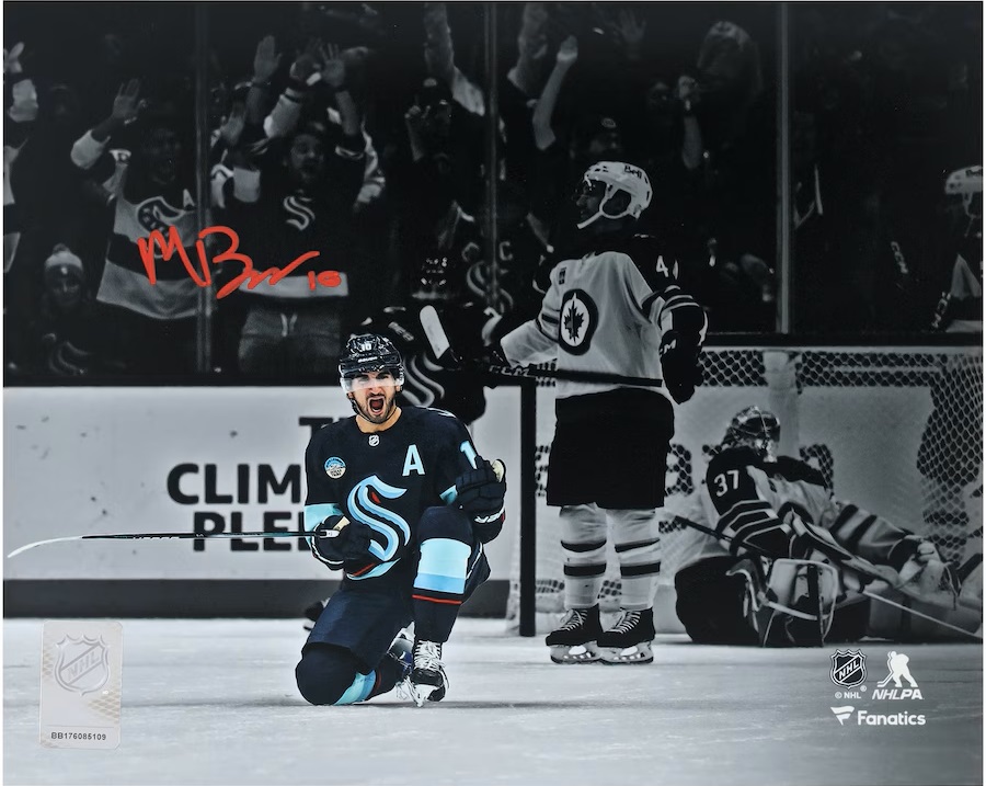 Elevate your collection of Seattle Kraken memorabilia with this Matty Beniers autographed 8" x 10" Navy Jersey Celebration Photograph. It features a bold image of the 2022-23 Calder Memorial Trophy winner and his distinct signature. Additionally, this photo includes an individually numbered, tamper evident hologram that can be verified online to certify authenticity.