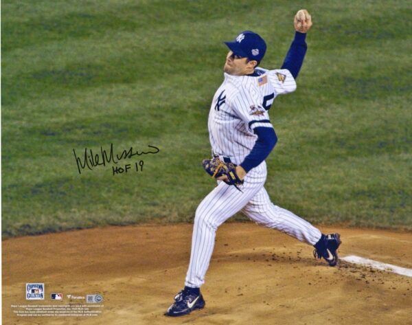 Mike Mussina New York Yankees Autographed 16″ x 20″ 2001 World Series Pitching Photograph with “HOF 19” Inscription